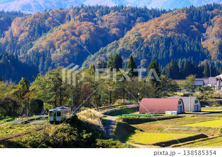 紅葉の長野県・青倉地区をコトコト走る飯山線の気動車