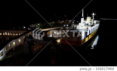 青森港の夜の青森フェリーターミナルに係留されている青函連絡船 八甲田丸
