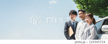 自動車購入・査定・買取にきた夫婦と接客するセールスマンの若いアジア人男性