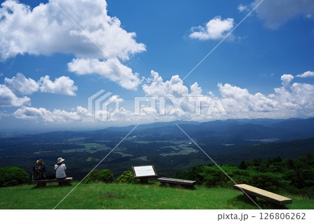 初夏の青山高原 白い雲と青空の円山草原からの眺望