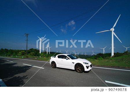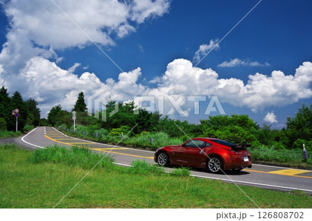 初夏の青山高原 白い雲と青空の下でドライブする赤いフェアレディZ