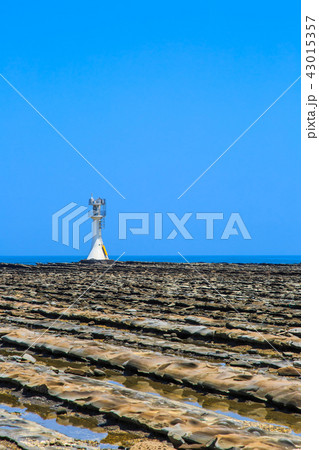 宮崎日向灘の青空に隆起海床できた鬼の洗濯岩の上に海積宮の青島神宮に祀られる海の神様を案内する白い燈台