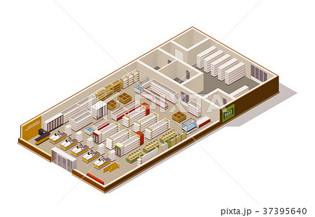 Vector isometric icon or infographic element representing supermarket building with parking lot, advertising signs and supermarket carts.