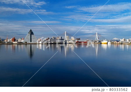 【青森県青森市】早朝の青森ベイエリア、快晴の風景