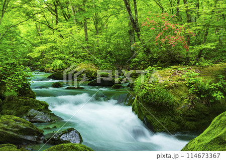 青森県十和田市の初夏 新緑の奥入瀬渓流 阿修羅の流れ