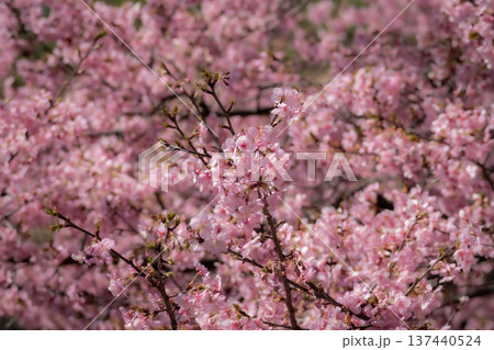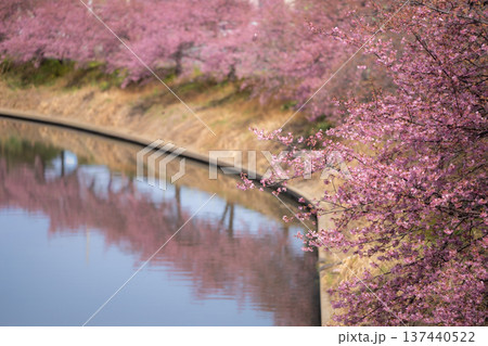「埼玉県」青毛堀川に咲く満開の河津桜・久喜市