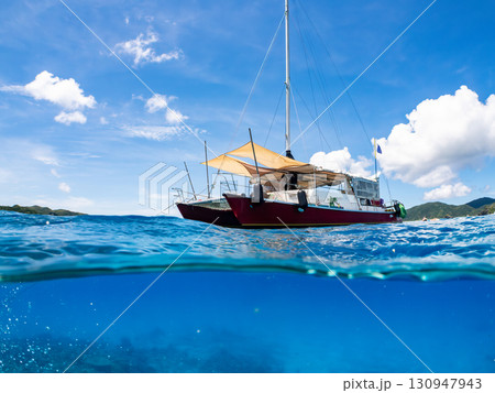 カタマランヨットのダイビングクルーズ船の半水面撮影。美しいサンゴ礁と熱帯魚の群れ。 沖縄県島尻郡慶良