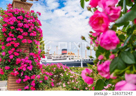 山下公園の美しいバラ園とランドマーク船「氷川丸」。