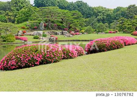 六義園の鮮やかなピンク色のサツキの花と庭園の新緑