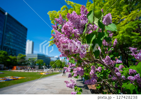 春の日比谷公園に咲く赤いチューリップの花が伸びやか