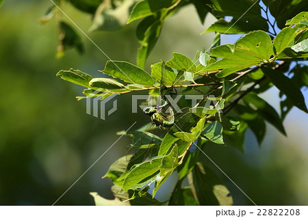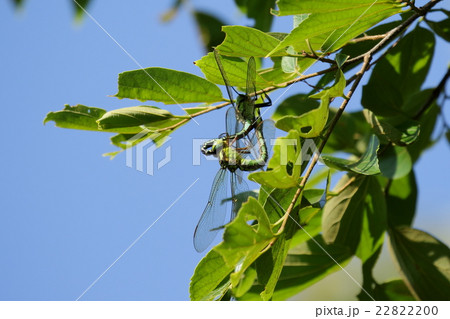 生き物 昆虫 アオヤンマ、池の近くに生えた木の梢に止まって交尾中