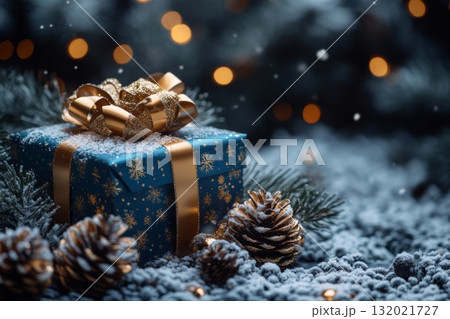 Festive christmas blue gift box with gold bow on snowy ground, decorated with pine cones