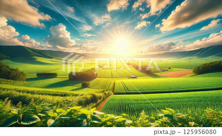 【新緑素材】朝日を受けて輝く青麦【長野県】