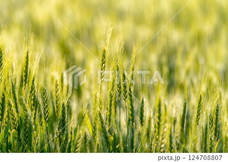 【新緑素材】朝日を受けて輝く青麦【長野県】
