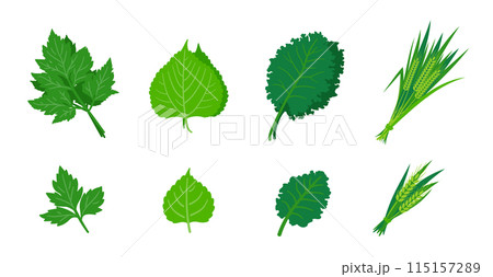 青汁の原材料の明日葉、桑の葉、ケール、大麦青葉のアイコンおよびマークのセット