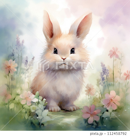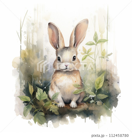 Mystical Rabbit sits on a path in enchanted forest landscape. magical forest with swirling clouds and floating lights. Easter egg. Watercolor style.