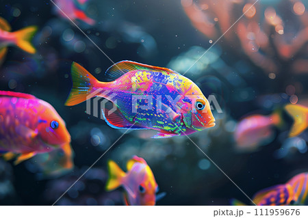 Bright tropical fish swimming in water or aquarium in neon glow and holographic Abstract animalistic background Modern design