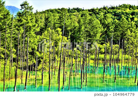 七月初旬に訪れる北海道美瑛の森に佇む神秘の池、白金青い池、そのブルーの水に吸い込まれそうな青