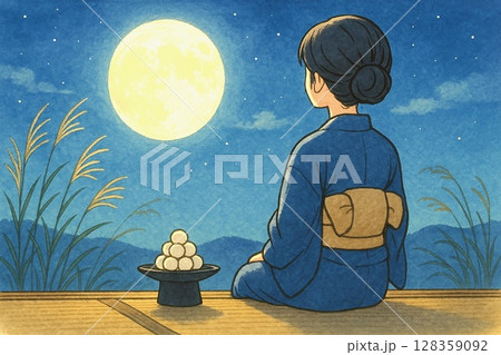 満月と団子とうさぎの秋 お月見イラスト素材 月と女性