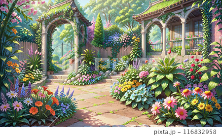 autumn garden with a pathway and a lot of flowers and trees in it and a cloudy sky in the background