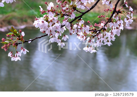 bend of the river in the city park in spring in good weather. Cafe on the river bank