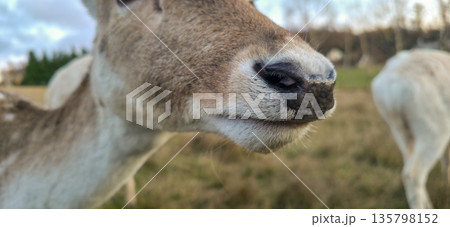 Deer close-up against a background of grass. Animals in the wild. High quality photo