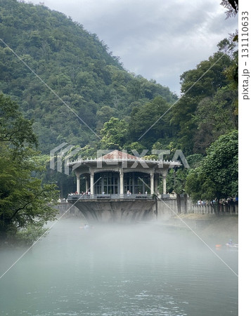 Pagoda by misty lakeside surrounded by lush trees under cloudy sky, suitable for background