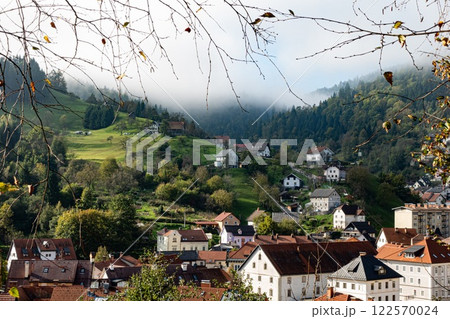 Idrija stunning bucolic view in the autumn. Green hill and old houses. Slovenia