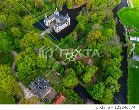 Aerial view of a historic castle surrounded by a forest, with vast green fields, winding waterways, and a river stretching across the flat Dutch countryside under a partly cloudy sky.