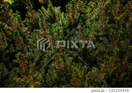 Dense green pine branches filling the frame under soft light. The concept conveys freshness, nature, and holiday atmosphere