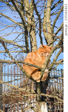 Cute ginger cat sitting on bare tree branches against blue sky and snow in winter garden