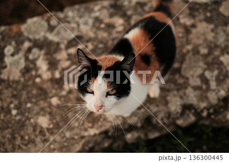 Tricolor cat standing on rough stone ground and looking directly upward. Natural light and shallow depth of field emphasize fur texture and animal character