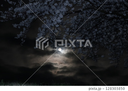満月に照らされた夜桜と雲間の月 春の幻想的な夜景