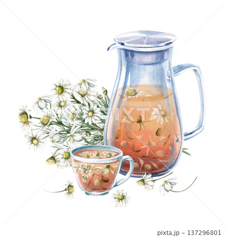 A watercolor illustration of chamomile tea in a pitcher and cup, adorned with fresh flowers. Perfect for designs related to natural beverages, spas, healthy living, restaurants, cafes, and eco-themes.