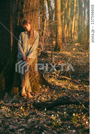 Woman Leaning Against Tree in Early Spring Forest