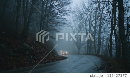 Cars Driving Through Foggy Mountain Road Surrounded by Bare Trees in Gloomy Weather