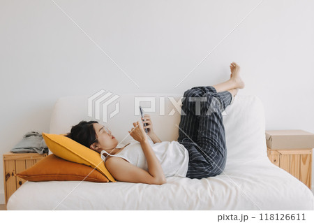 Serene minimalist bedroom interior in modern home. calm room with scandinavian design, simple furniture and bright natural light, creating very peaceful atmosphere