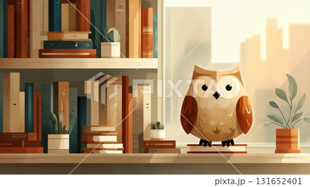 Cute Cartoon Owl Sitting on Bookshelf with Colorful Books