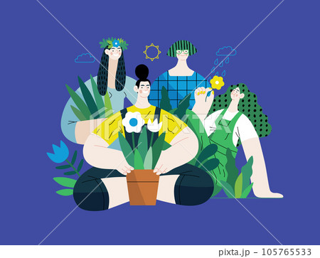 Greenery, ecology -modern flat vector concept illustration of people surrounded by plants and flowers. Metaphor of environmental sustainability and protection, closeness to nature