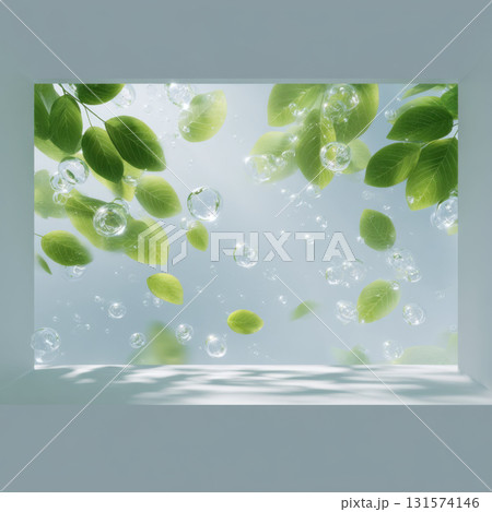 Invigorating fresh green leaf and natural water bubble floating on clean background. product podium for presentation, evoking feeling of calm purity and refreshment
