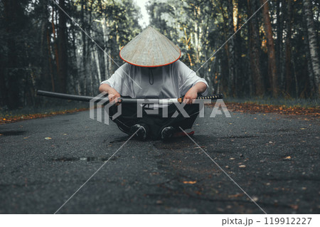 A warrior in a straw hat sits on a path in the forest, holding a katana in both hands. A female warrior practices meditation before a fight. A warrior sits on the road and unsheathes a katana.