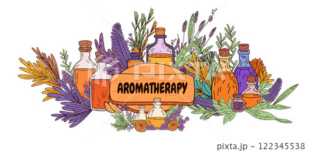 Aromatherapy essential oils herbal bottles nature plants colorful leaves lavender orange purple green decorative design