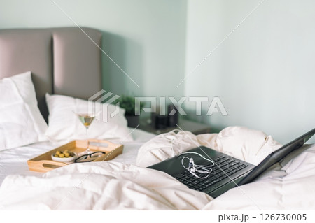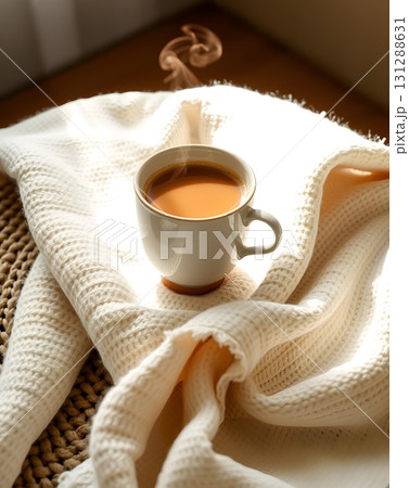 Aesthetic photo of a coffee mug on a white blanket, with steam rising elegantly.