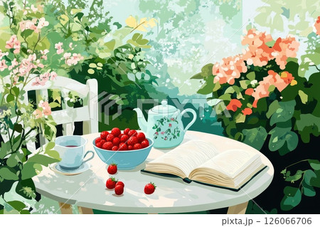 Enjoying a relaxing afternoon at a dacha veranda with tea, berries, and a good book
