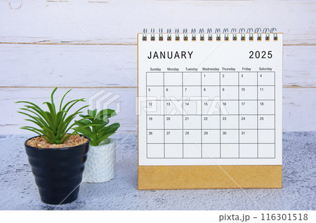 January 2025 calendar with white wooden wall background. New month and calendar concept