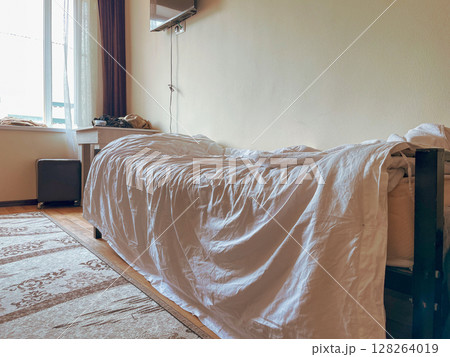 A partially made bed with a white, wrinkled sheet draped over it. The room features a window with natural light, a small table, and a dark storage box.