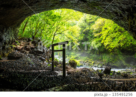 宮崎県 高千穂 天安河原 仰慕ヶ窟に広がる積み石と鳥居の風景