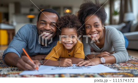 AI-generated content. In the living room, little boys and girls were playing drawing together on the floor with their parents relaxing on the sofa, the parents were enjoying leisure time in the living