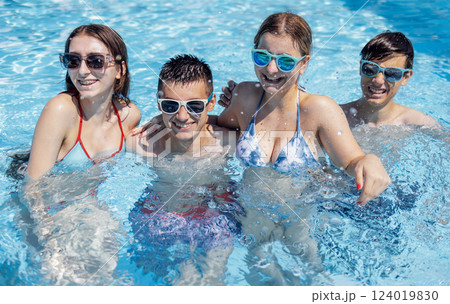 Funny teenagers in swimsuits and sunglasses in the pool. Joyful children are having fun in the water.