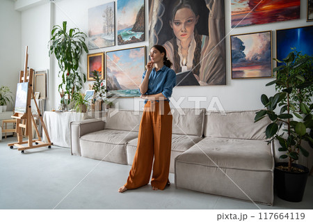 Pensive female artist in home art studio. Woman contemplatively examining workshop room, thinking